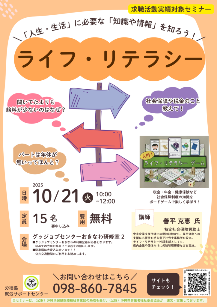 - みなさん、こんにちは、就労サポートセンターの比嘉です。年金・保険・税金・労務・社会保障など、人生のさまざまなイベントを想定したボードゲームを使って、楽しく遊びながら社会の仕組みを分かりやすく学ぶためのセミナーです。社会で暮らしていくための必要な知識「人生や生活に必要な知識を持ち、使いこなせる力(ライフ・リテラシー)」ですので、求職活動中の方、すでに在職中だけど学んでみたい方も是非、参加してみませんか?